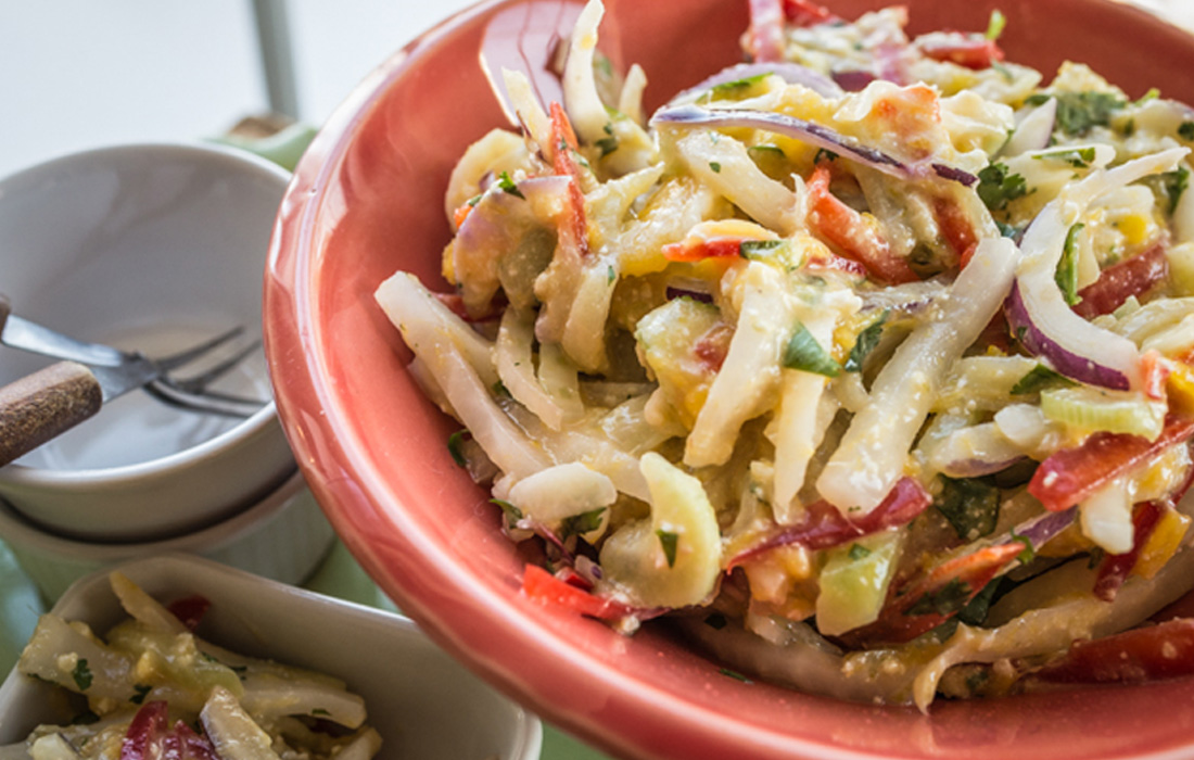 Get your tropical vibe going with this cool and crunchy slaw. It’s a great upscale accompaniment to veggie burgers or bean tacos.