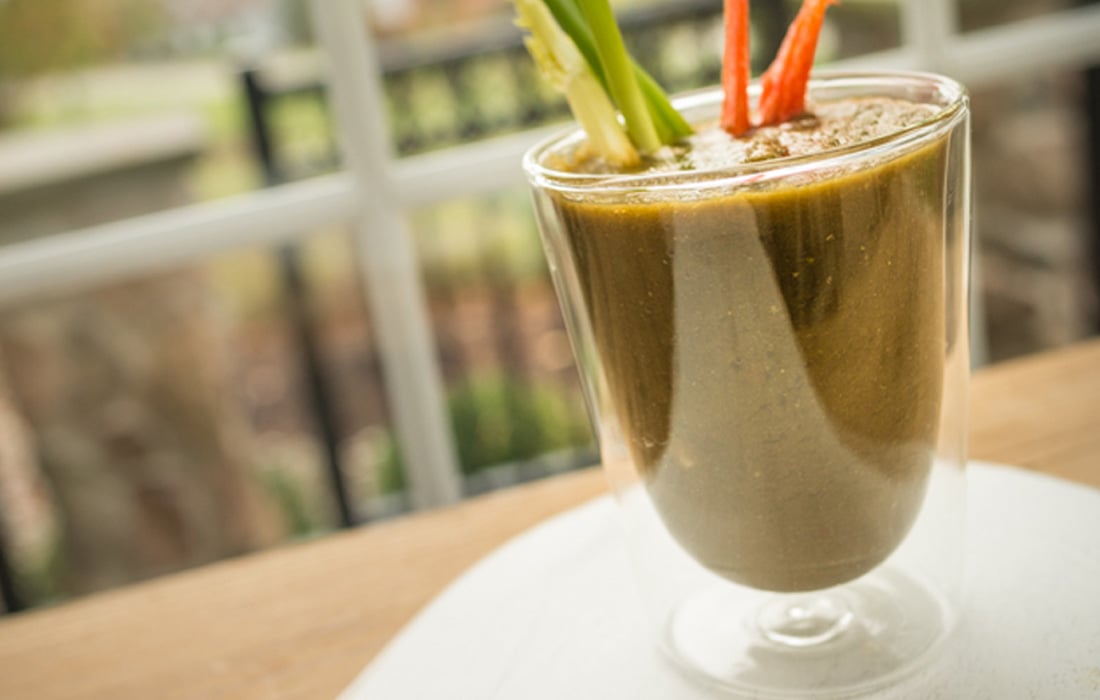 Blend a tasty combination of vegetables with a splash of lemon and some fresh horseradish for a deliciously savory drinkable salad. It's a great way to eat more vegetables.