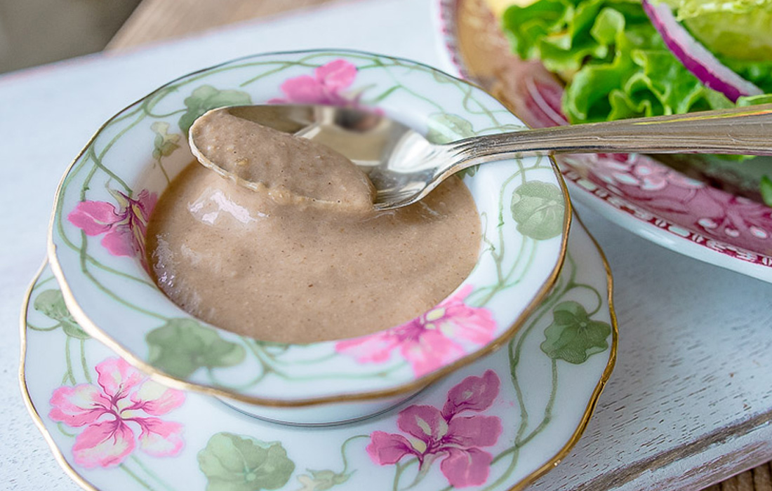 Tahini or sesame seeds are blended together with lemon, raisins and a touch of garlic and cumin for a unique dressing that works on salad or cooked vegetables.