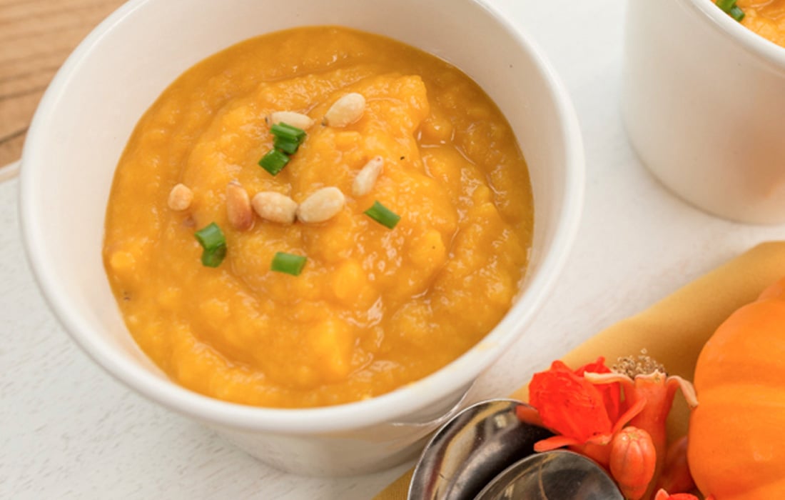 For a festive and flavorful fall soup, gently roast butternut squash and apples with onions, garlic and jalapeno. Blend with some broth and non-dairy milk and garnish with a sprinkle of pine nuts or pumpkin seeds.