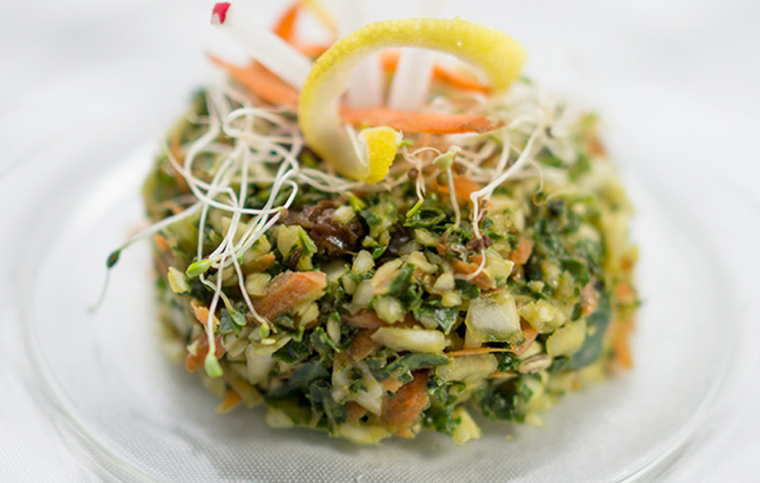 An updated take on traditional coleslaw, this salad features nutrient-rich kale and cabbage tossed with lemon, raisins, and a tasty medley of sesame, caraway and fennel seeds.