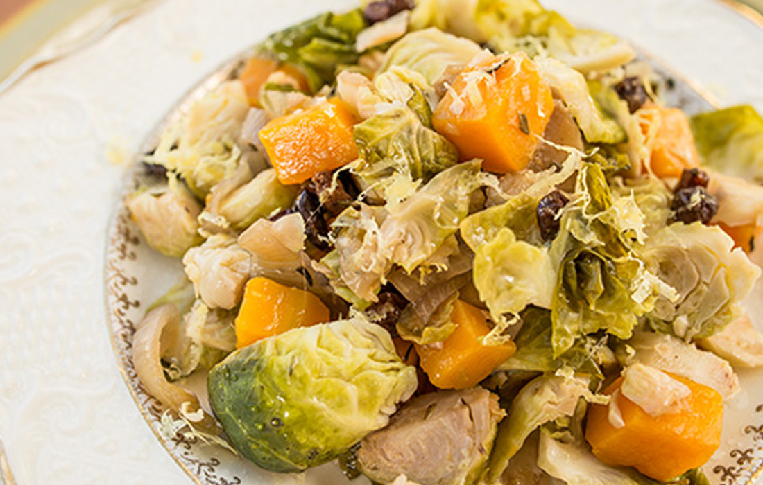 This elegant, company-worthy dish pairs tasty lightly steamed Brussels sprouts with roasted shallots and butternut squash. Brussels sprouts are members of the nutrient-dense family of cruciferous vegetables which also includes kale, cauliflower and broccoli.