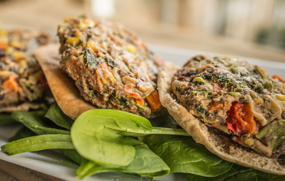 Greens, beans, onions, mushrooms and seeds, all packed into a tasty burger. Add some baked sweet potato fries and cold watermelon and you have a super summer supper!
