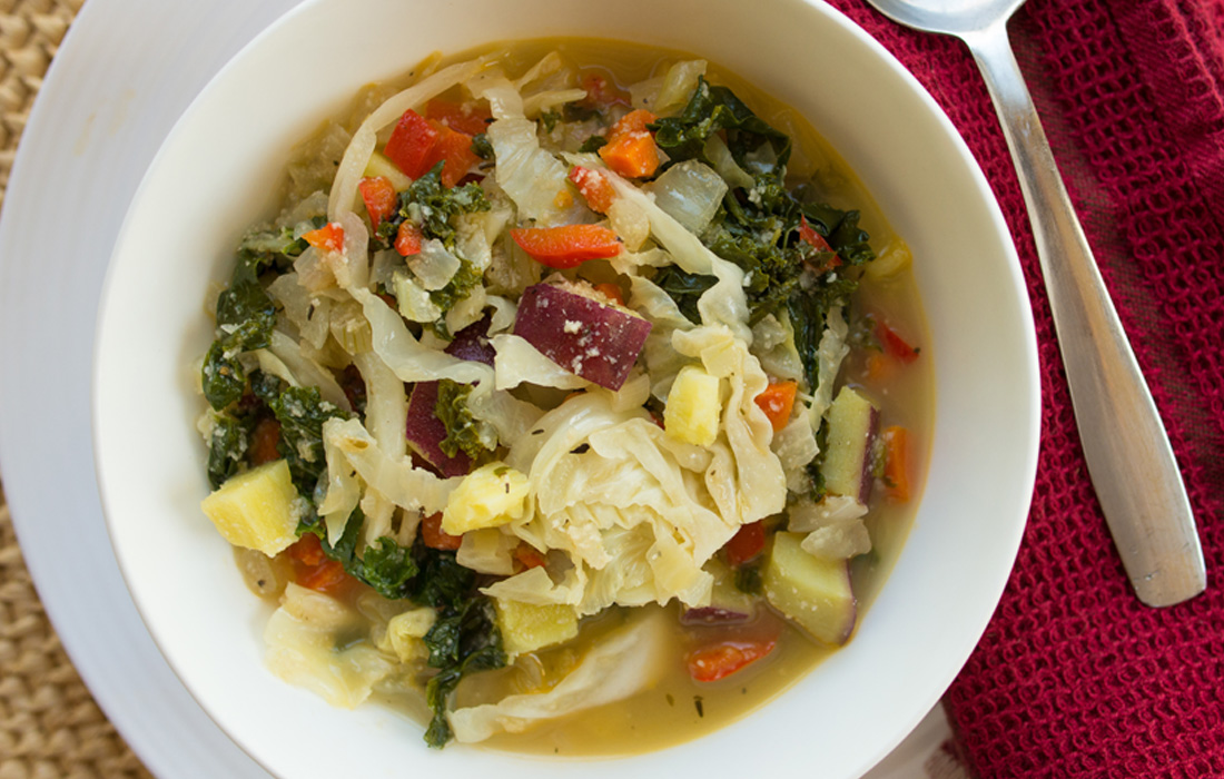 This stew features greens and sweet potatoes simmered in a hearty coconut broth. It was inspired by a traditional Jamaican recipe.