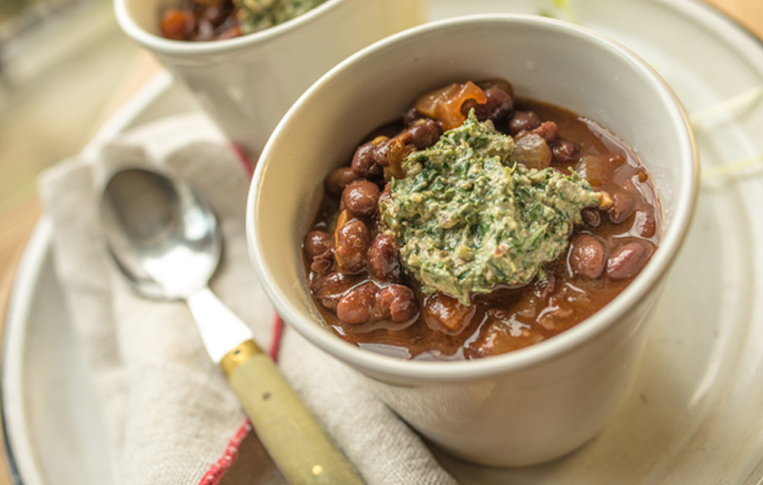 Take the chill out of the air and put a smile on your face with this hearty black bean chili. Serve it topped with a dollop of tasty pecan and cilantro pesto for a special finishing touch.