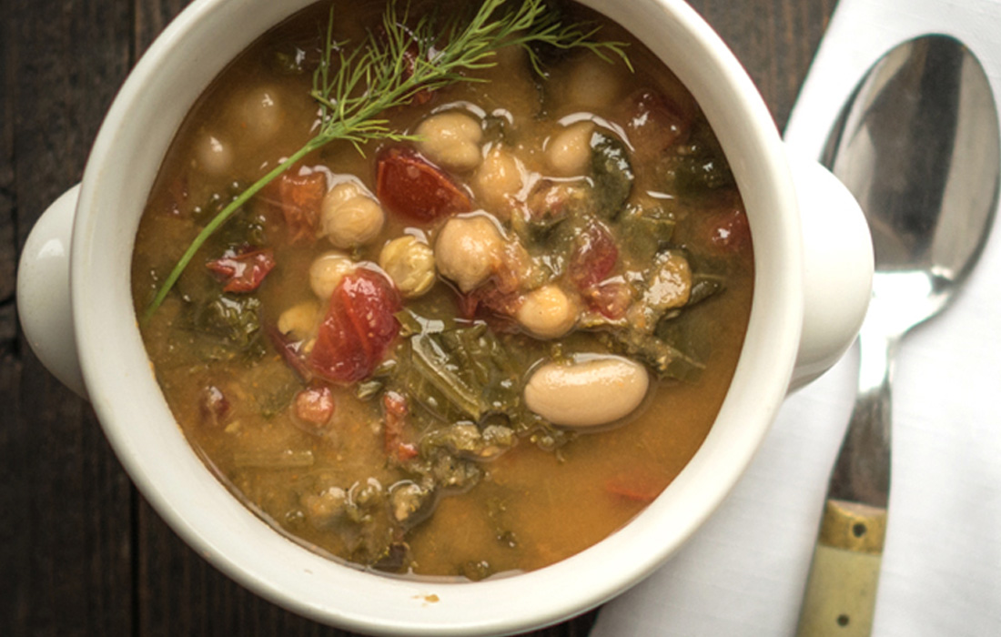 Ribollita means twice-cooked in Italian and is also the name of a famous Tuscan soup. In this Nutritarian version, beans are cooked with onions, garlic and other seasonings and then blended to make a rich, creamy stock to which greens, tomatoes and additional beans are added. This hearty recipe makes enough for several meals.