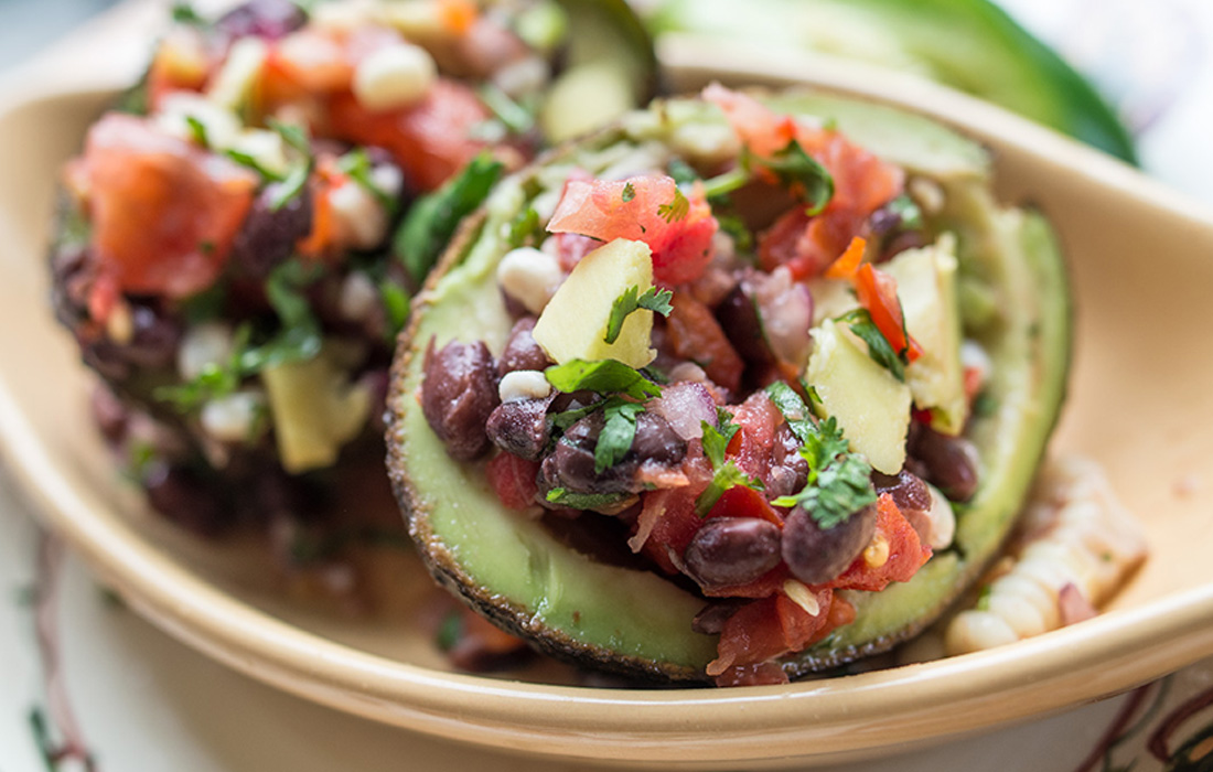 Avocado halves make creative and tasty serving bowls for this lively black bean salad. The creamy texture of the avocado complements the salad and the healthful fat maximizes nutrient absorption.