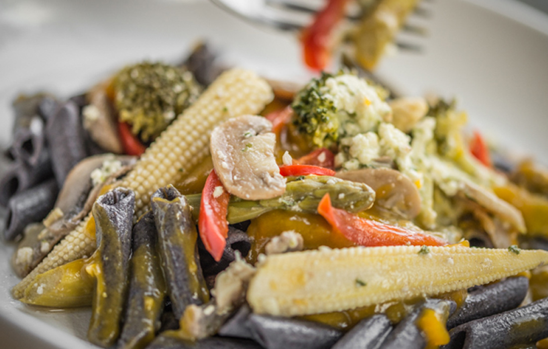 Try topping your bean pasta with a creamy sauce made from butternut squash. Add fresh veggies and a dollop of cashew and pine nut pesto to round out the dish.