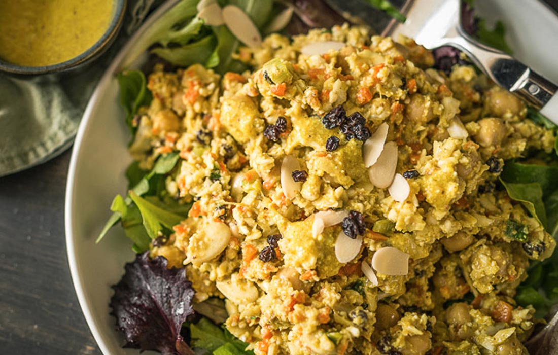 Make a different, delicious and super-healthful salad by tossing riced cauliflower and chickpeas with a creamy mango-curry dressing.
