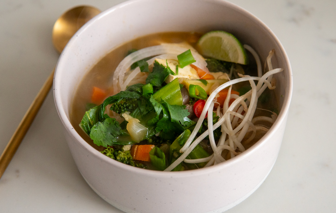 Pho is a popular street food in Vietnam that is influenced by both French and Chinese cuisines. This bowl of Asian vegetables, fresh herbs, bean noodles and fragrant broth is a meal in itself.