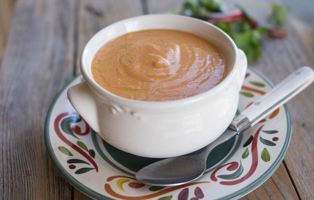Savor the flavors of sweet corn and red bell pepper in this creamy, blended soup. If you don’t like it spicy, cut back on the chili peppers.