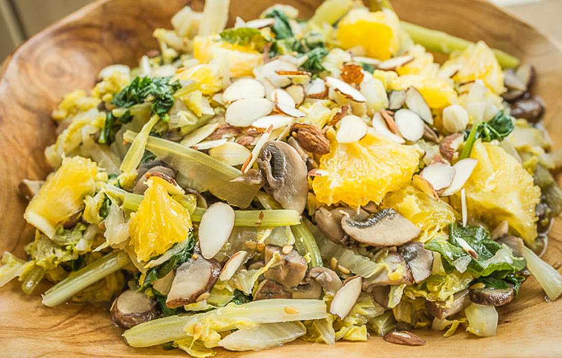 A great winter dish, this warm salad features Napa cabbage and mushrooms, lightly sautéed with garlic, ginger and sesame seeds. A final toss with almonds and orange segments provides a sweet and crunchy finish.