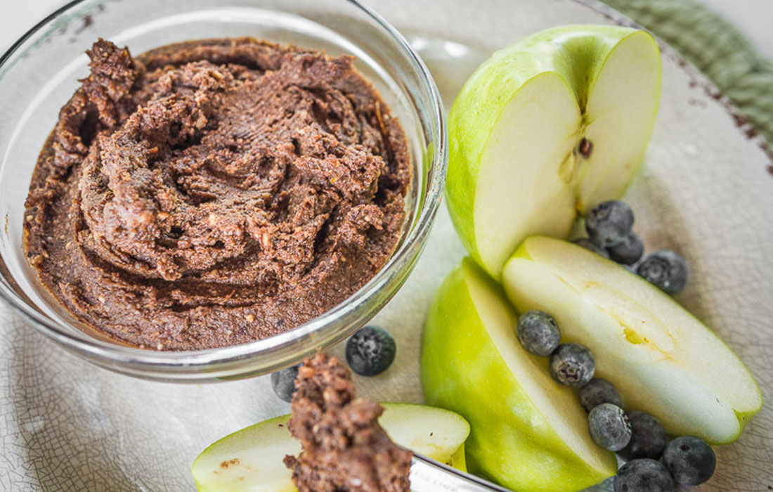 No need to feel guilty about indulging in this delicious chocolate hazelnut spread. Enjoy it for breakfast or dessert, spread on apples, bananas or romaine lettuce leaves.