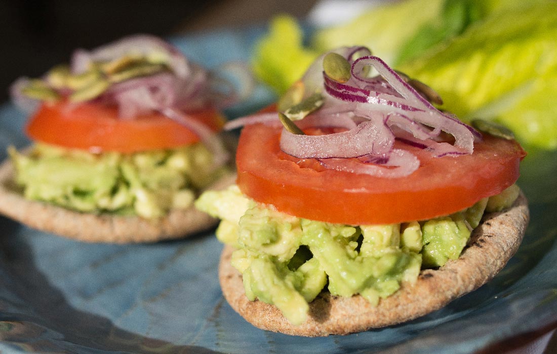 Avocado Toast with Sliced Tomatoes and Toasted Pumpkin Seeds