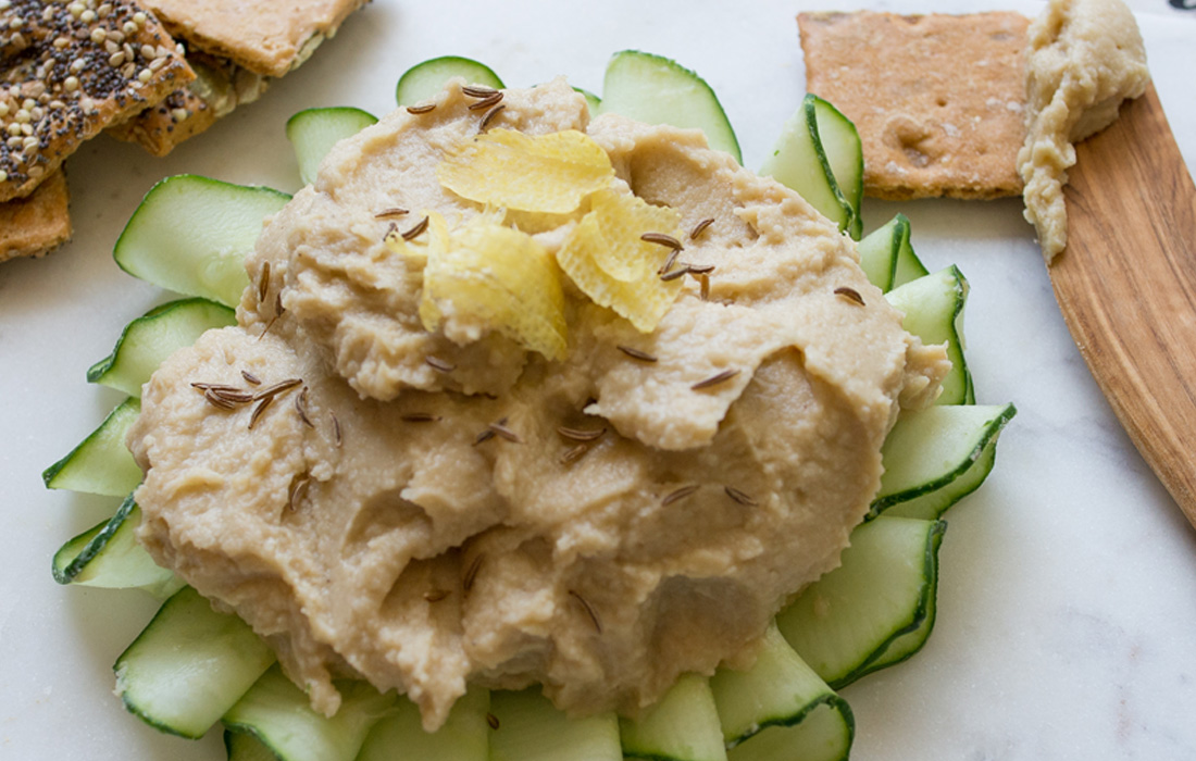 An extra twist of lemon and some caraway seeds give this no-oil hummus its distinctive flavor. Serve it with an assortment of crispy, colorful raw veggies.