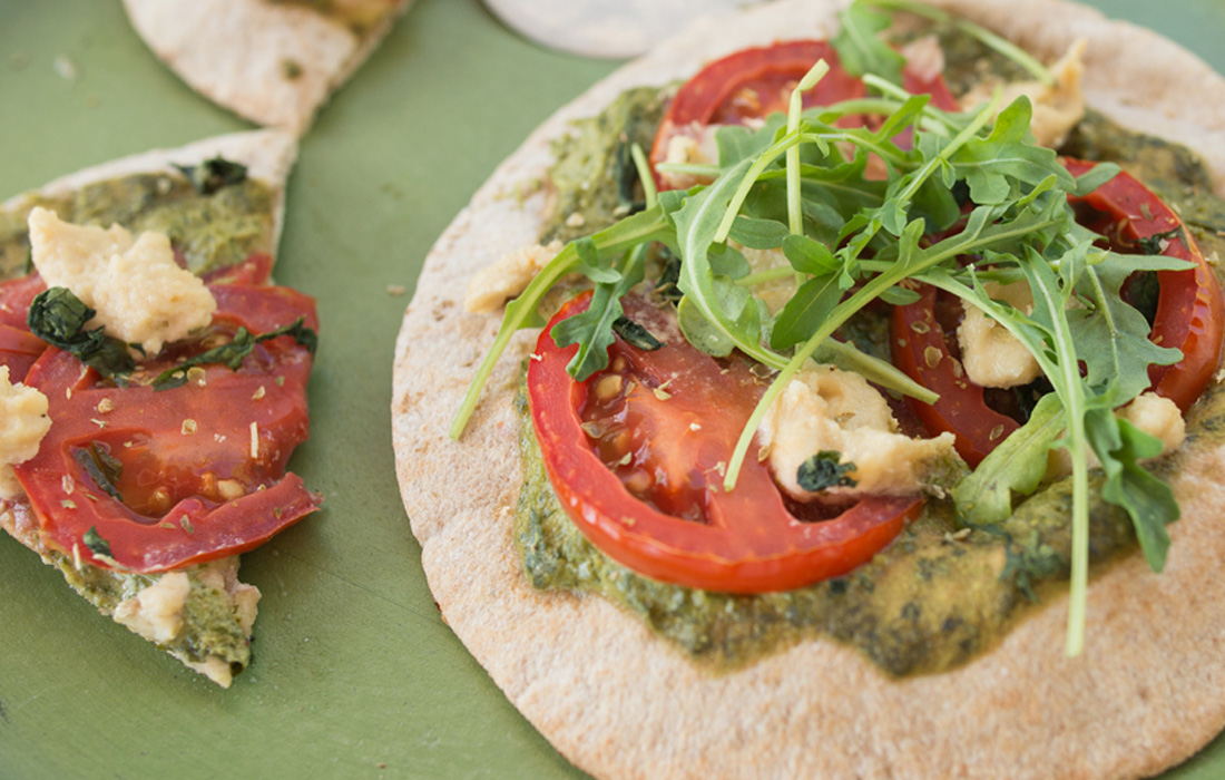 Construct a good-for-you pizza using tasty green pesto, creamy cashew cheese and a generous topping of leafy greens.