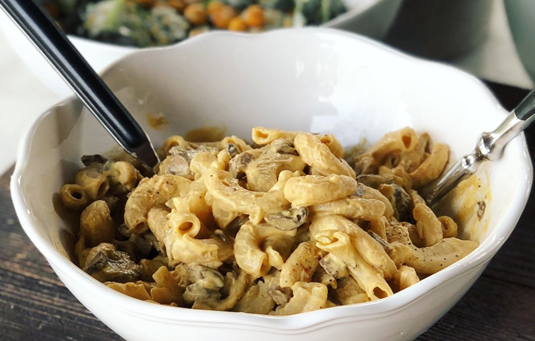 Combine a creamy vegan cheese sauce with bean pasta and mushrooms. It's delicious and guilt-free!