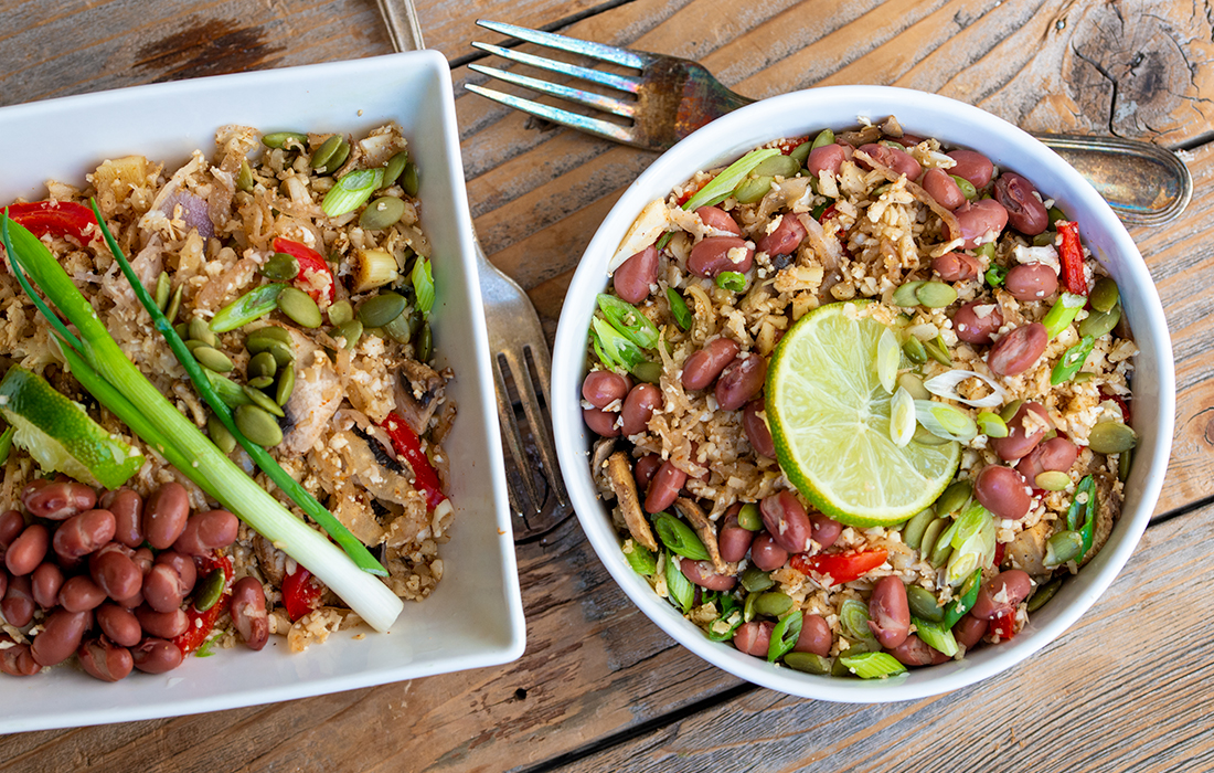 Start your bowl with seasoned cauliflower rice, add some beans and then finish off with all your favorite toppings. Fast, healthy and delicious!