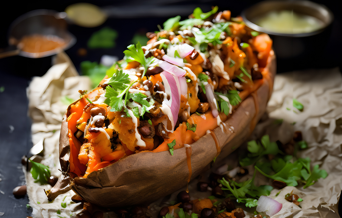 Kick off the tailgate party with flavor-packed sweet potatoes! The Cheezy Nacho Sauce is a real winner.