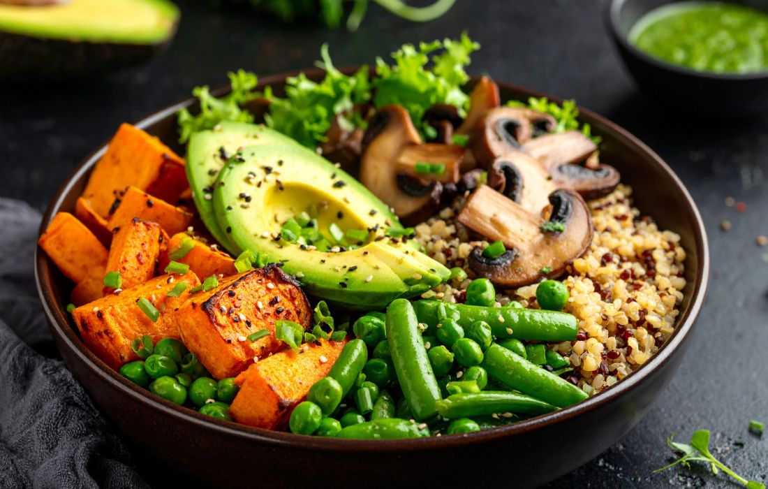 A hearty, plant-powered bowl featuring fluffy quinoa and farro, roasted sweet potatoes, mushrooms, snow peas, and red onion, all topped with a vibrant cilantro pumpkin seed pesto and creamy avocado. Perfectly satisfying, nutrient-rich, and free from added salt, oil, and sugar.