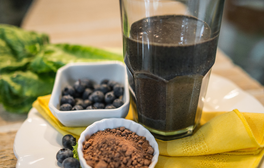 A fabulous smoothie that tastes like a chocolate shake. It also works with cherries or other berries and any combination of greens!