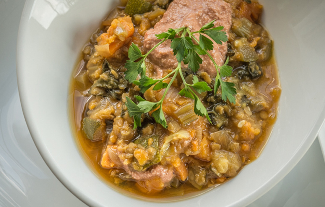 This stew is packed with lentils and greens. It’s served with a dollop of tomato almond sauce for a rich burst of tomato flavor.