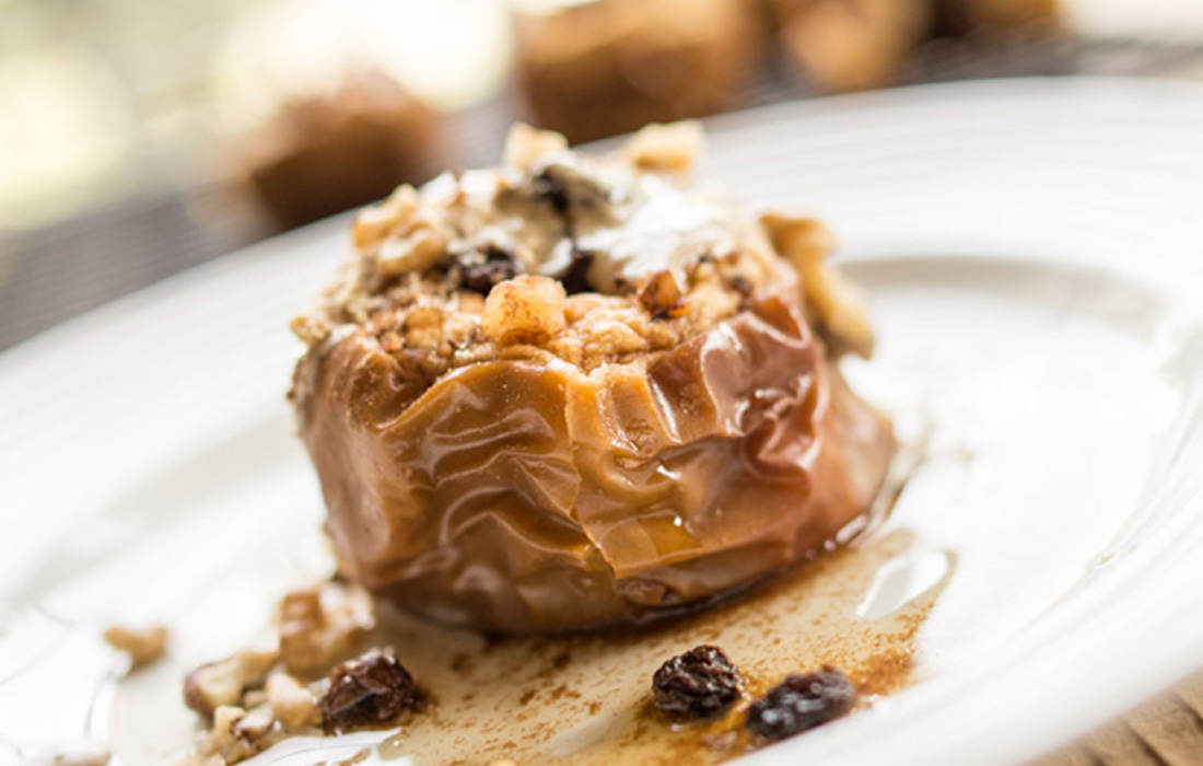 This good-for-you gourmet dessert features apples stuffed with walnuts and cinnamon, topped with a delicious sauce. Apples contain a wide variety of phytochemicals and are rich in pectin, a type of soluble fiber that helps to lower cholesterol.