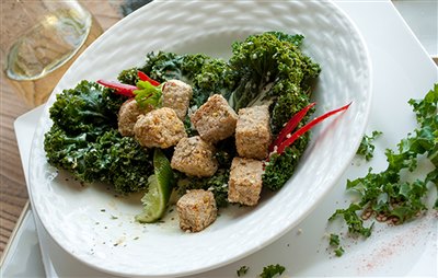 Coconut Ginger Kale with Sesame-Crusted Tempeh