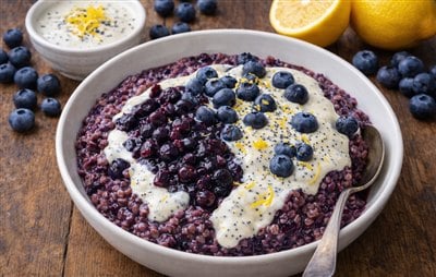 Blueberry Steel-Cut Oats with Lemon Poppy Seed Cream