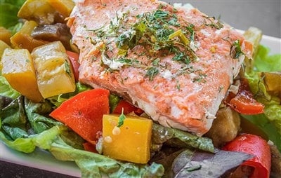 Roasted Vegetable Salad topped with Salmon
