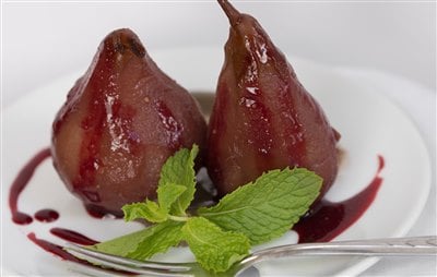 Pomegranate Poached Pears with Chocolate and Raspberry Sauces