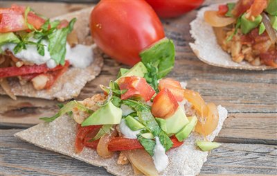 Nachos with Homemade Cornmeal Tortillas, Tempeh Nacho Topping and Tahini Cheese