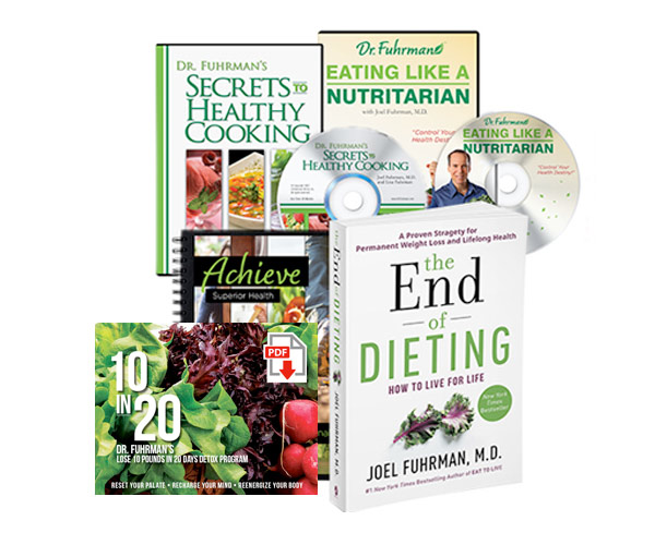 Looking to achieve sustainable weight loss and finally get off the fad diet merry-go-round? Dr. Fuhrman’s Weight Loss Starter Kit is the ideal resource to help you gain an in-depth understanding of how to achieve sustainable weight loss and greatly improved health. You’ll be able to download the digital 10 in 20 Detox Program and start losing weight immediately, while you learn the science and advanced techniques in Dr. Fuhrman’s book, The End of Dieting. Your kit includes: